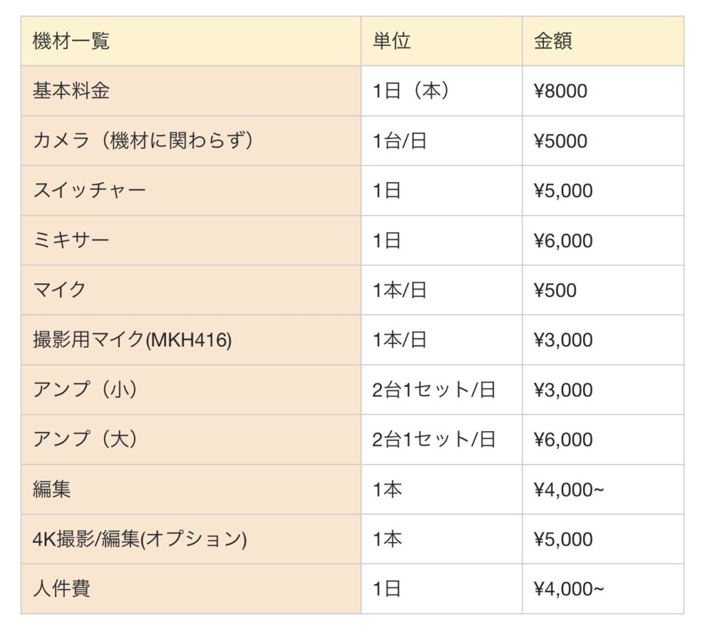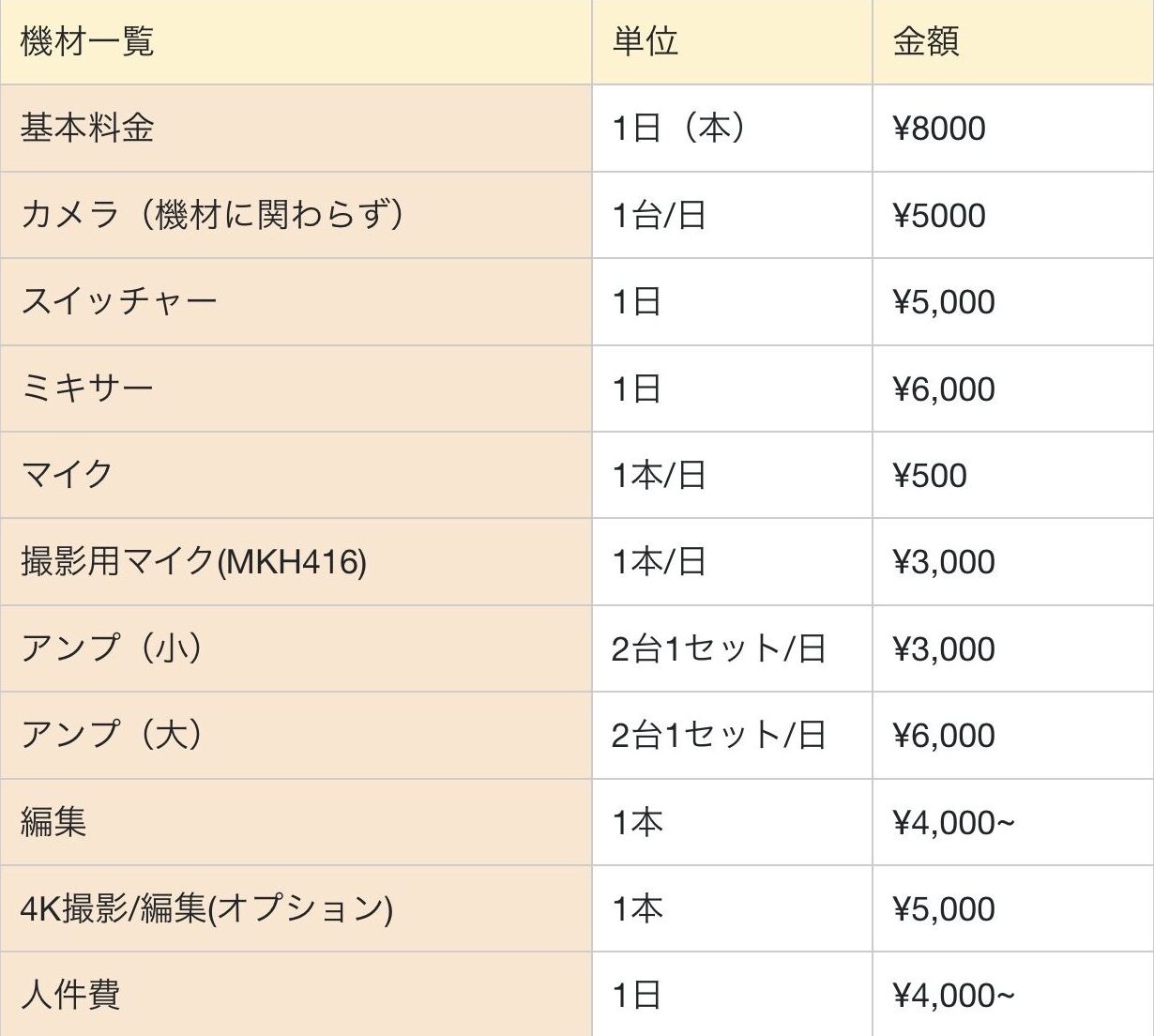 ※あくまでも目安のため、新機材導入に使用機材に変更がある場合や依頼内容によっては料金に多少の変更が生じますことをご了承ください。